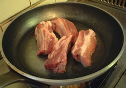 家にあったのは、じゃがいも・人参・玉ねぎ・長ねぎ・にんにく。これらを使ってさて、どうするか。なんとなく豚の骨つきバラ肉とマッシュルームを買って来て、まとめて煮込むことにしました。野菜類をデカ目に切って、っつっても一応メントリとかする私ですが、豚肉の表面を焼いて、全部まとめて白ワインぶちこんで煮込みます。煮込んでる途中で冷蔵庫にソーセージを1本だけ見つけたので、それも入れときました。